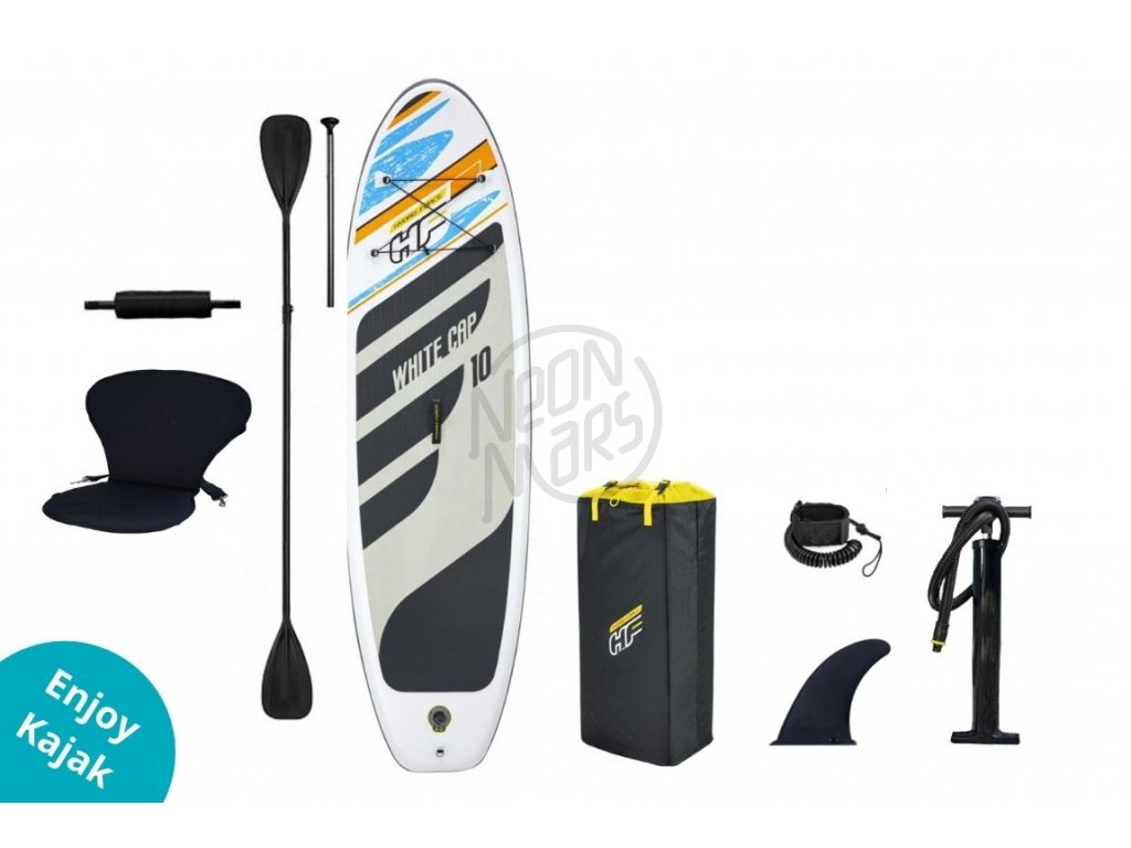 SUP Hydro Force Oceana White Cap je skvelou doskou za veľmi priaznivú cenu s bohatým príslušenstvom. Ak ťa omrzí pádlovanie v stoji, jednoducho a rýchlo zmeníš tento paddleboard na kajak. Stačí pripevniť kajakovú sedačku o 4 kovové očká a upraviť pádlo na kajakové pridaním druhého listu. Paddleboard Hydro Force Oceana White Cap je vybavený bungee lanom, pod ktoré môžeš dať suchý vak s výbavou, neoprénovým pútkom pre jednoduchý prenos dosky k vode a ďalšími dvomi kovovými očkami, jedno vzadu na uchytenie leashu a druhé vpredu na ukotvenie dosky alebo na ťahanie. O skvelé držanie smeru sa postará slide in plutvička, ktorú rýchlo a bez použitia nástrojov môžeš nasadiť.